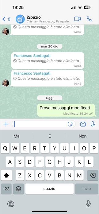 La prima novità riguarda l’aggiunta del tasto Modifica, come avevamo già segnalato, permetterà agli utenti di apportare modifiche o correzioni ad un messaggio inviato entro un periodo massimo di 15 minuti dall’invio dello stesso. Dopo la modifica, apparirà la scritta “Modificato”, esattamente come su Telegram. Diversamente da iMessage, non sarà possibile visualizzare la cronologia delle modifiche, quindi non si potrà vedere cosa c’era scritto prima della modifica.