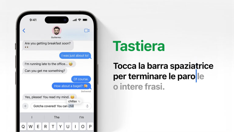 Facciamo un esempio: Se scriviamo spesso “fatti mandare dalla mamma a prendere il latte“, iOS 17 lo imparerà e non appena inizieremo a scrivere “fatti mandare” farà comparire il resto della frase con un colore più chiaro. Basterà poi premere la barra spaziatrice per “accettare” il suggerimento ed inserire automaticamente il resto della parola o della frase senza doverlo scrivere.