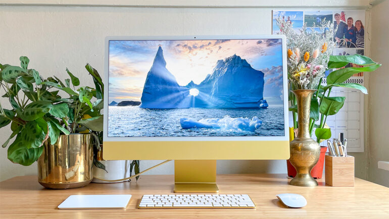 Apple ha rilasciato l’iMac da 24 pollici nell’aprile 2021 con il chip M1 e un design ultrasottile disponibile in sette colori, tra cui blu, verde, rosa, argento, giallo, arancione e viola.