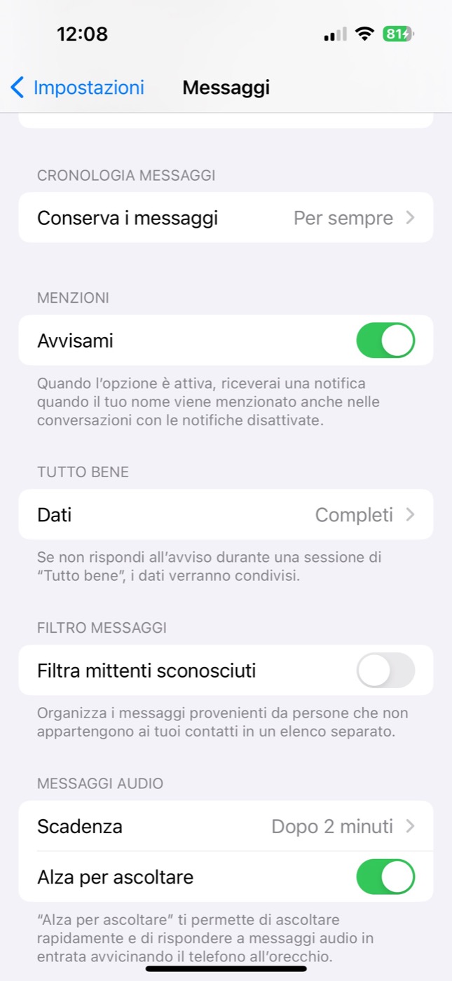 La funzione “Check-In” in italiano viene tradotta con “Tutto Bene”. Adesso, entrando in Impostazioni> Messaggi troviamo una modifica alla dicitura delle opzioni dati. Precedentemente trovavamo scritto “Solo posizione attuale” oppure ” Tutte le località visitate” adesso invece troviamo “Completi” oppure “Limitati”.
