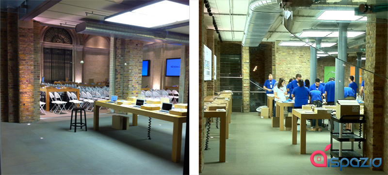 Nelle foto che iSpazio ha ricevuto direttamente dall’Apple Store di Covent Garden a Londra da Tommaso Menegardi e Iacopo Panozzo, possiamo vedere come a seguito di una riunione, gli impiegati dello Store si siano riuniti per iniziare ad applicare il cambiamento più eclatante, che riguarda i vecchi cartelli d’informazione, tramite i quali si potevano leggere le informazioni sui prodotti in esposizione.