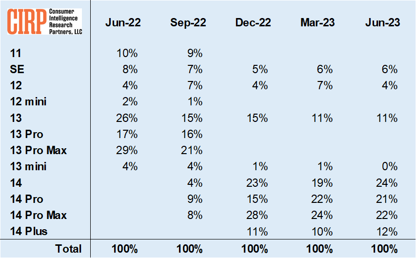 Analizzando come l’uso di Apple Music e Apple TV+ varia in base all’età, l’ultimo rapporto del CIRP torna a esaminare l’adozione degli iPhone. Secondo i nuovi dati, la gamma iPhone 14 ha raggiunto la quota più alta di vendite tra tutti gli iPhone venduti negli Stati Uniti dalla gamma iPhone 7 nel 2017.