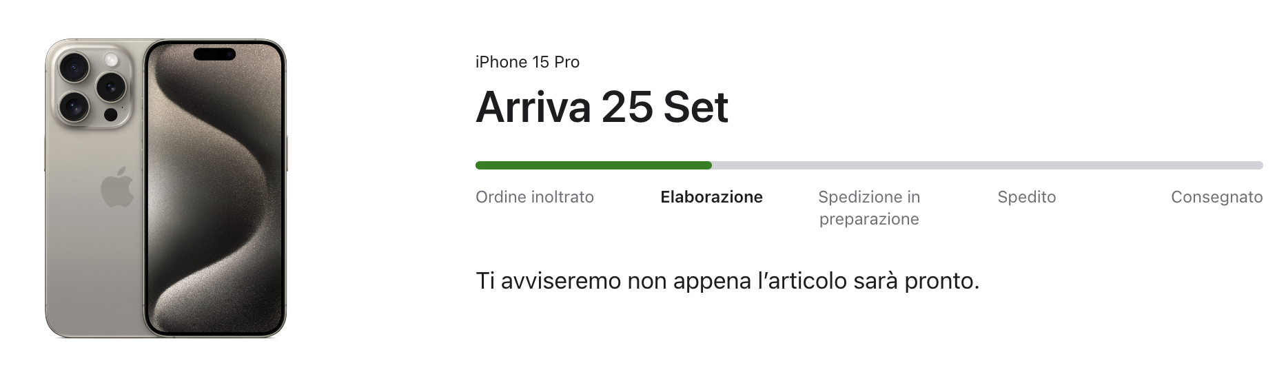 Anche per un ordine effettuato dal nostro Rocco alle 14:03 (non chiedetemi come abbia fatto a fare così presto perchè a me il sito è tornato online soltanto alle 14:17) la consegna è stata spostata dal 22 Settembre al 25 Set – 2 Ottobre. Lo stesso discorso vale anche per il mio iPhone 15 Pro passato dal 22 Settembre al 25 Settembre.