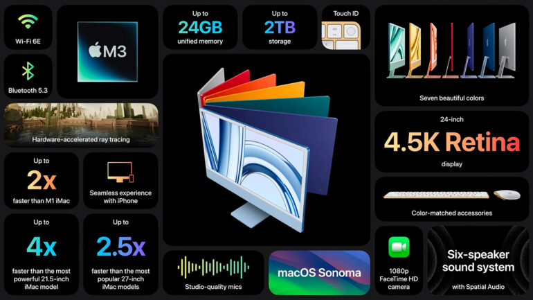 L’iMac da 24 pollici ha ricevuto un significativo aggiornamento con l’introduzione del nuovo chip M3, garantendo prestazioni notevolmente superiori rispetto alla precedente versione con chip M1. Tuttavia, dal momento che non veniva rinnovato dal 2021, sono state aggiunte anche alcune nuove funzionalità.