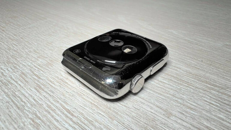 Il retro di questo prototipo in acciaio inossidabile presenta la stessa disposizione dei tre sensori per il rilevamento del battito cardiaco del modello del 2014, posizionati orizzontalmente. Tuttavia, si differenzia per le incisioni laser generiche, in contrasto con quelle definitive riportanti il numero di modello.