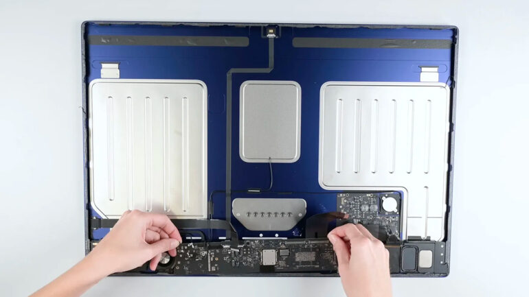 In generale, l’interno dell’iMac appare simile a quello del modello M1. Tuttavia, c’è una differenza significativa: mentre l’iMac M1 ha due batterie CMOS (Complementary Metal Oxide Semiconductor), il nuovo modello ne ha solo una. iFixit scherza addirittura sull’iMac M3, affermando che ha la “batteria più facilmente sostituibile” tra i dispositivi Apple.
