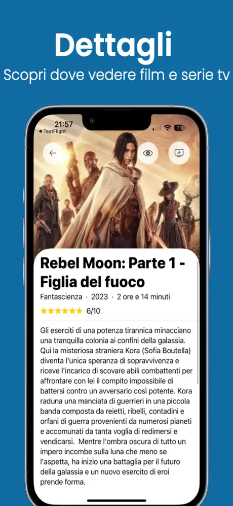 Toccando l’icona dell’occhio in alto a destra potremo aggiungere qualcosa alla lista “Da Guardare”. Toccando invece sull’icona della TV in alto a destra, ci verrà rivelato su quale piattaforma streaming è possibile trovare il titolo.