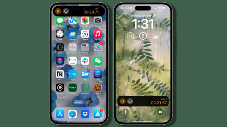 L’Isola dinamica mostra un piccolo timer al secondo, mentre la schermata di blocco mostra il cronometro completo quando lo schermo è acceso. Premere sull’Isola dinamica mostra opzioni per mettere in pausa il cronometro o avviare un nuovo giro, con questi comandi disponibili anche sulla schermata di blocco. Dopo che il cronometro è stato messo in pausa, sarà possibile eliminarlo scorrendo dalla schermata di blocco o toccando la “X” nell’Isola dinamica.