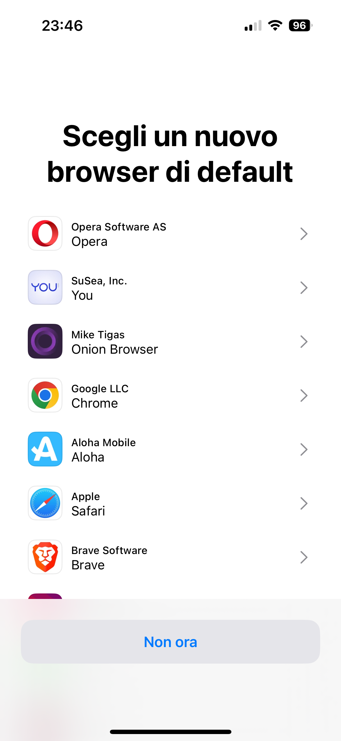 L’unica novità di questa nuova build è che al primo avvio di Safari si aprirà una schermata con la lista di tutti i browser che possiamo impostare come predefiniti. Cliccando sull’icona di qualsiasi browser presente nell’elenco si aprirà la pagina dedicata dell’App Store (se non abbiamo l’app installata), oppure si aprirà il browser.