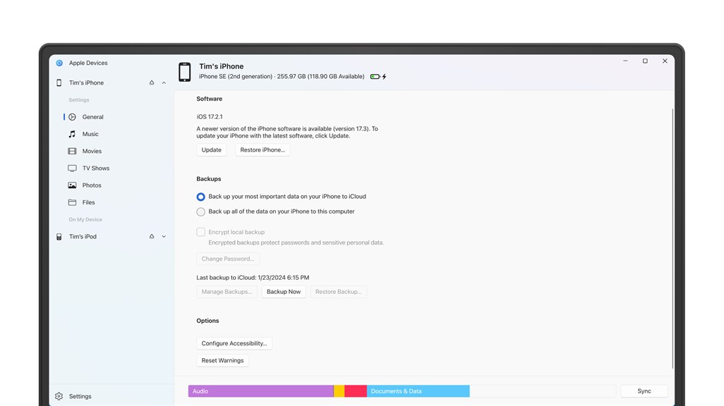 Infine, l’applicazione Dispositivi Apple permette agli utenti di aggiornare e gestire il proprio iPhone, inclusi i backup, i ripristini e la sincronizzazione dei contenuti.