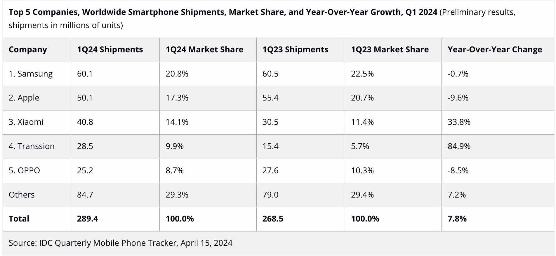 Mentre Apple è riuscita a conquistare il primo posto alla fine del 2023, Samsung è riuscita con successo a riaffermarsi come il principale fornitore di smartphone nel primo trimestre. Sebbene IDC si aspetti che queste due aziende mantengano la loro presa sulla fascia alta del mercato, la ripresa di Huawei in Cina, così come i guadagni notevoli da parte di Xiaomi, Transsion, OPPO/OnePlus e vivo probabilmente porteranno entrambi gli OEM a cercare aree di espansione e diversificazione. Con il progredire della ripresa, è probabile che le aziende di punta guadagnino quote di mercato mentre i marchi più piccoli lottano per posizionarsi.