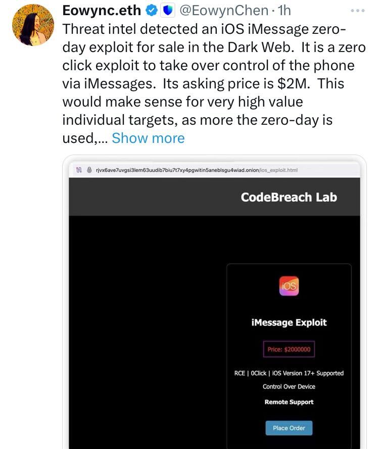 Il CEO dell’azienda, Eowyn Chen, ha condiviso uno screenshot che afferma essere un potenziale exploit zero-day, mostrando un prezzo richiesto di 2 milioni di dollari per l’exploit.