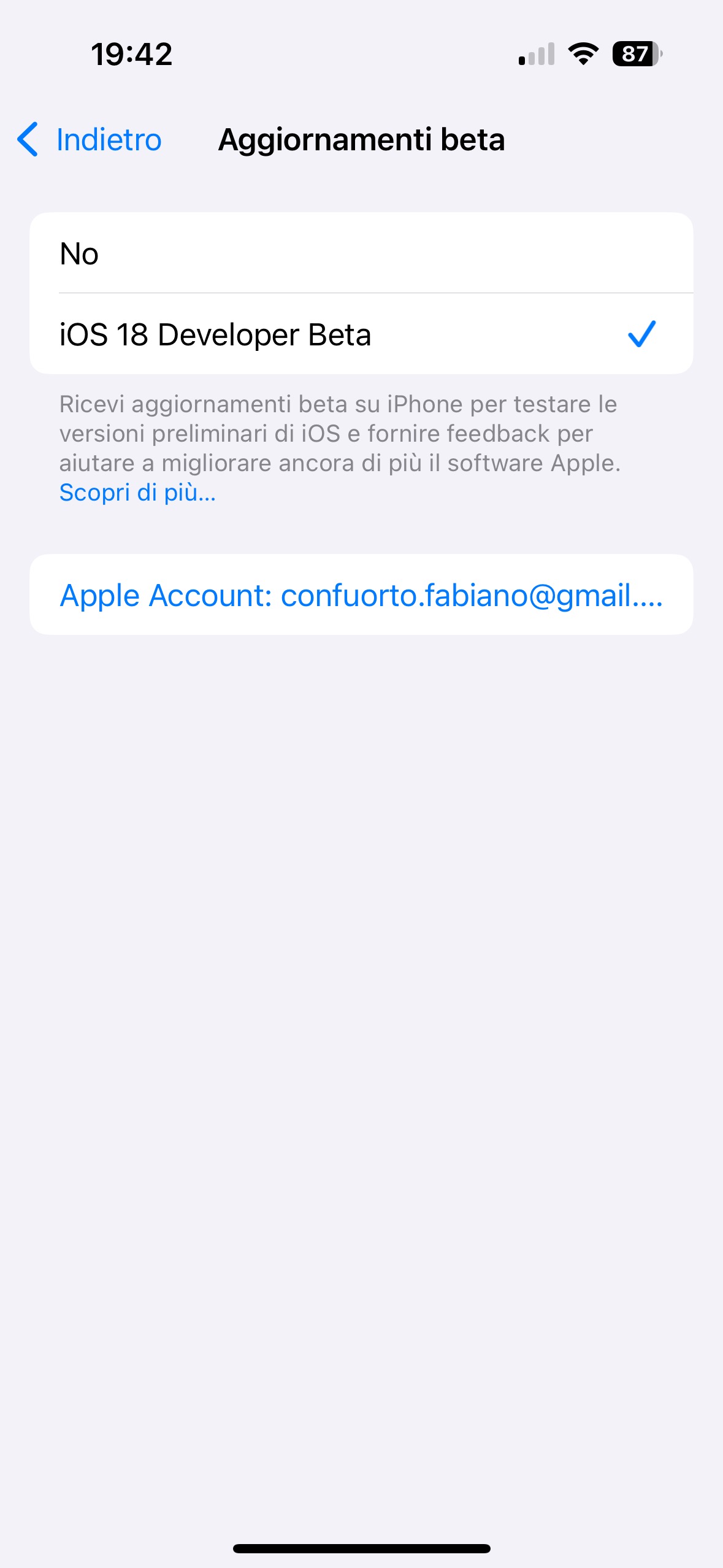 3. Dovreste già vedere il vostro Apple ID nella parte bassa della schermata. Attendete qualche secondo e vedrete spuntare “iOS 18 Developer Beta”. Selezionatelo e poi tornate indietro alla schermata precedente.