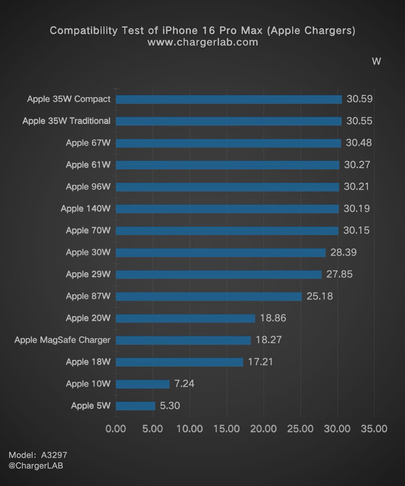 Secondo un test di ChargerLAB, l’iPhone 16 Pro Max ha toccato una velocità di ricarica massima sostenuta di circa 30W utilizzando diversi caricabatterie, sia Apple che di terze parti. Con il caricatore da 140W di Apple, il dispositivo ha raggiunto un picco di 37W, ma resta poco chiaro per quanto tempo è riuscito a mantenere questa velocità. Sebbene si tratti di un miglioramento rispetto ai 27W riportati per l’iPhone 15 Pro, è evidente che i nuovi modelli non arrivano ai 45W dichiarati.