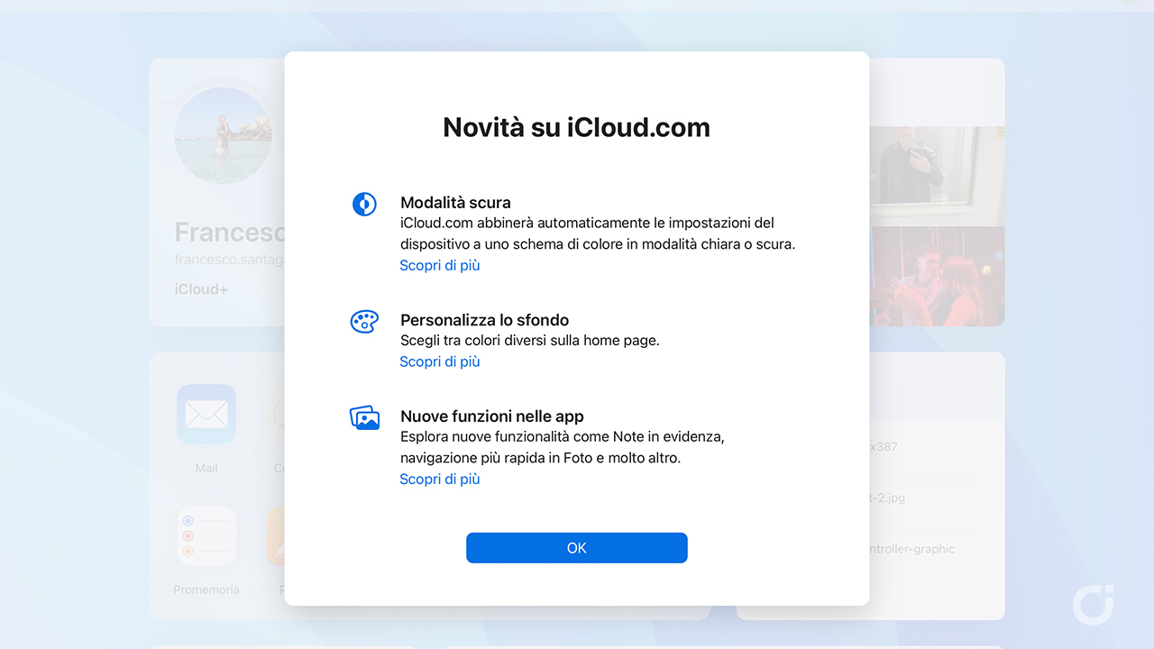 Una delle novità più richieste è il supporto per la Modalità scura, che permette a iCloud.com di adattarsi automaticamente alle impostazioni del dispositivo. Se abbiamo abilitato la modalità scura sul nostro iPhone, iPad o Mac, il sito di iCloud adotterà lo stesso schema di colori, offrendo un’esperienza visiva più confortevole, soprattutto in condizioni di scarsa luminosità.