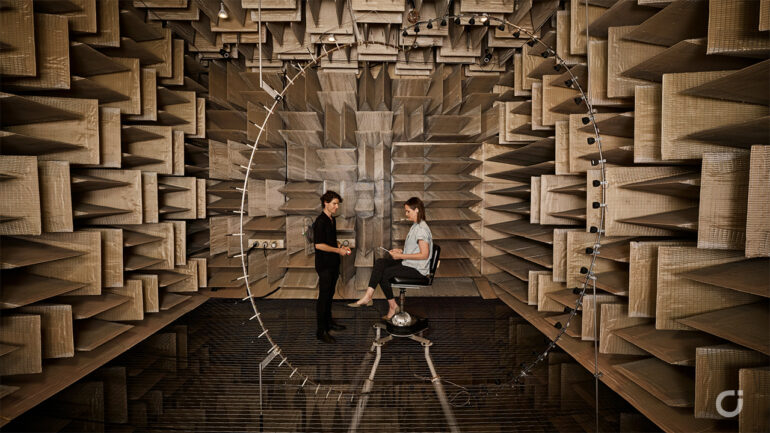 Un altro spazio all’interno del laboratorio è il Fantasia Lab, dotato di una sfera con 50 altoparlanti, che permette di simulare vari scenari sonori reali, come una strada affollata o l’interno di un aereo.