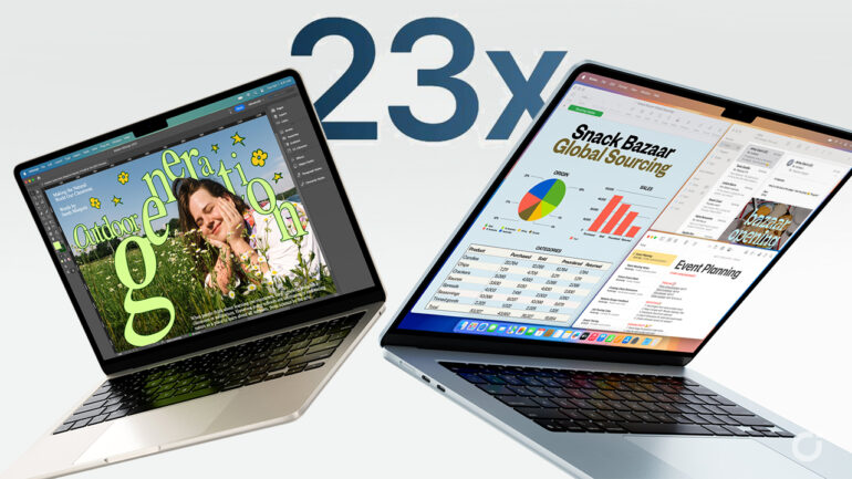 Secondo l’azienda, il nuovo modello è fino a 23 volte più veloce dell’ultimo MacBook Air basato su Intel. Tuttavia, ci sono alcuni dettagli da considerare prima di prendere questa cifra alla lettera.