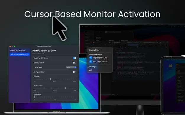 Se utilizzi più monitor o Sidecar con iPad, Display Flow + Care garantisce un’esperienza fluida su ogni dispositivo. L’app rileva automaticamente quando il cursore si sposta tra gli schermi e applica le impostazioni di protezione senza interferire con il tuo lavoro.