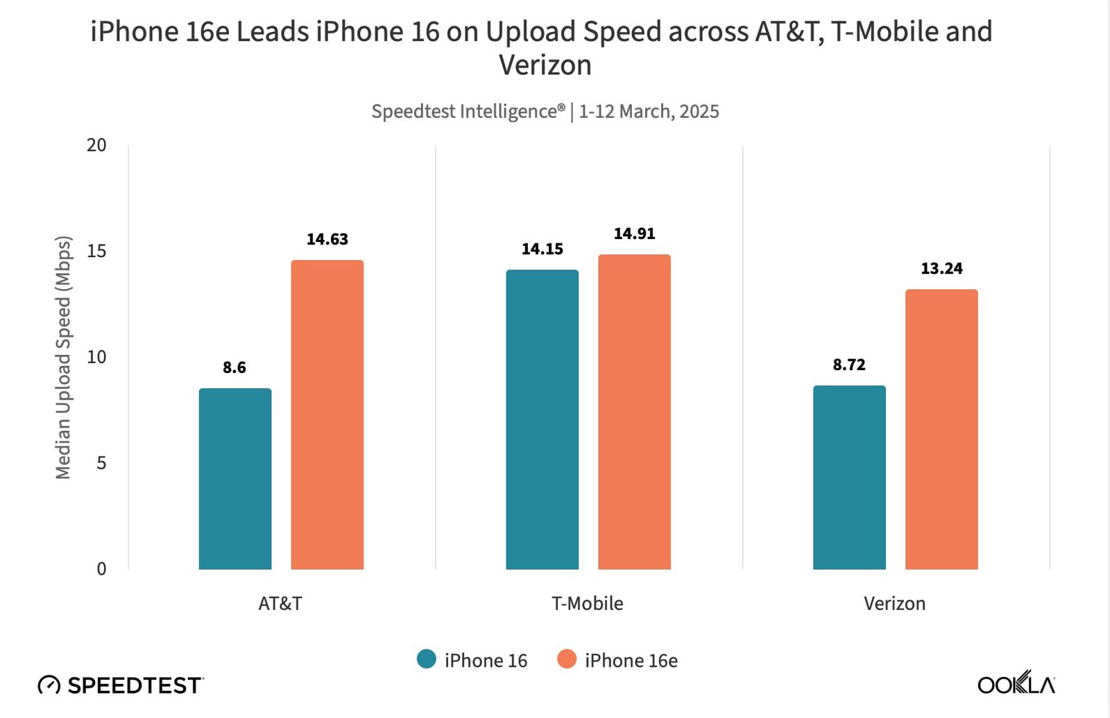I primi test di velocità hanno rivelato risultati sorprendenti. L’iPhone 16e, in alcuni scenari, riesce a superare persino il modello standard iPhone 16 dotato di modem Qualcomm. Tuttavia, il quadro generale è più complesso e mostra che le prestazioni possono variare in base al tipo di rete e alle condizioni di utilizzo.
