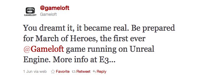Pare che finalmente ci avviciniamo all’annuncio ufficiale del primo dei giochi anticipati alcuni mesi fa da Gameloft, titoli realizzati con il motore grafico Unreal Engine lo stesso utilizzato per Infinity Blade e Dungeon Defenders: First Wave. Gameloft mostrerà all’E3 (come si legge sul canale Twitter) March of Heroes, nuovo gioco per iPhone, iPod Touch e iPad del quale, tuttavia, si conosce soltanto il nome.