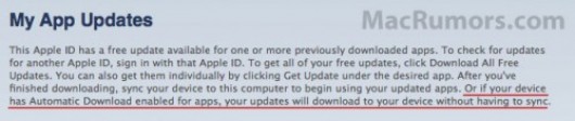 Il messaggio pare che sia già stato rimosso da iTunes ripristinando il precedente, ma resta il fatto che attualmente nessuna versione di iOS dispone di un’opzione relativa ai download automatici, gli utenti devono esplicitamente aprire l’applicazione dell’App Store e avviare manualmente l’aggiornamento delle app installate.