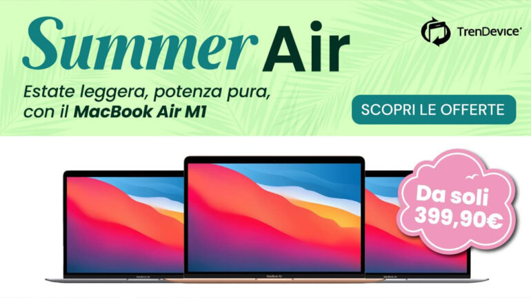 L’estate su TrenDevice vi regala l’occasione per rinnovare il vostro Mac con stile, performance e risparmio. Il protagonista indiscusso della stagione è il MacBook Air M1: il portatile Apple che ha rivoluzionato il concetto di potenza ed efficienza, oggi disponibile su TrenDevice a partire da soli 399,90€.
