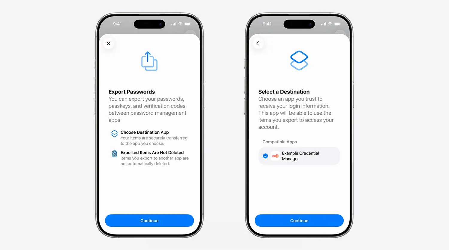 Apple ha sottolineato come l’intero processo avvenga in maniera end-to-end criptata, senza esportare file su disco come accadeva con i vecchi metodi (es. file CSV o JSON). I trasferimenti avvengono direttamente da app a app oppure dal portachiavi di sistema verso un’applicazione di gestione delle credenziali. Il tutto è protetto da Face ID o Touch ID, a garanzia dell’identità dell’utente.