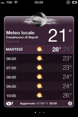 Innanzitutto vi diciamo che l’applicazione Meteo, che non veniva aggiornata dall’iOS 1, è stata finalmente arricchita! Adesso basterà un tap su un giorno della settimana per espandere l’elenco, ottenendo informazioni dettagliate sulle condizioni metereologiche nelle varie ore del giorno! Inoltre dalla schermata delle impostazioni è possibile attivare e disattivare il meteo locale (che si ottiene mediante geolocalizzazione automatica) e che compare con un nuovo simbolino in sostituzione del classico “dot”