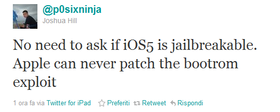 Come è ormai consuetudine con ogni nuovo aggiornamento di iOS, numerose persone si chiedono se e quando verrà rilasciato il jailbreak da poter effettuare sui propri dispositivi. E’ stato anche il caso di iOS 5, presentato ieri e la cui beta per sviluppatori è già disponibile. A rispondere al quesito sulla bocca di tutti è stato p0sixninja, membro del Chronic-Dev Team e colui che ha il merito per il jailbreak dei firmware 4.2 e 4.3 con l’utilizzo di Greenpois0n.