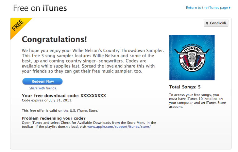 Brevissimo articolo per segnalarvi di un’interessante iniziativa. Accendendo alla fan page di iTunes su Facebook è possibile scaricare gratuitamente 5 diverse canzoni. La promozione è valida solo per lo store US.