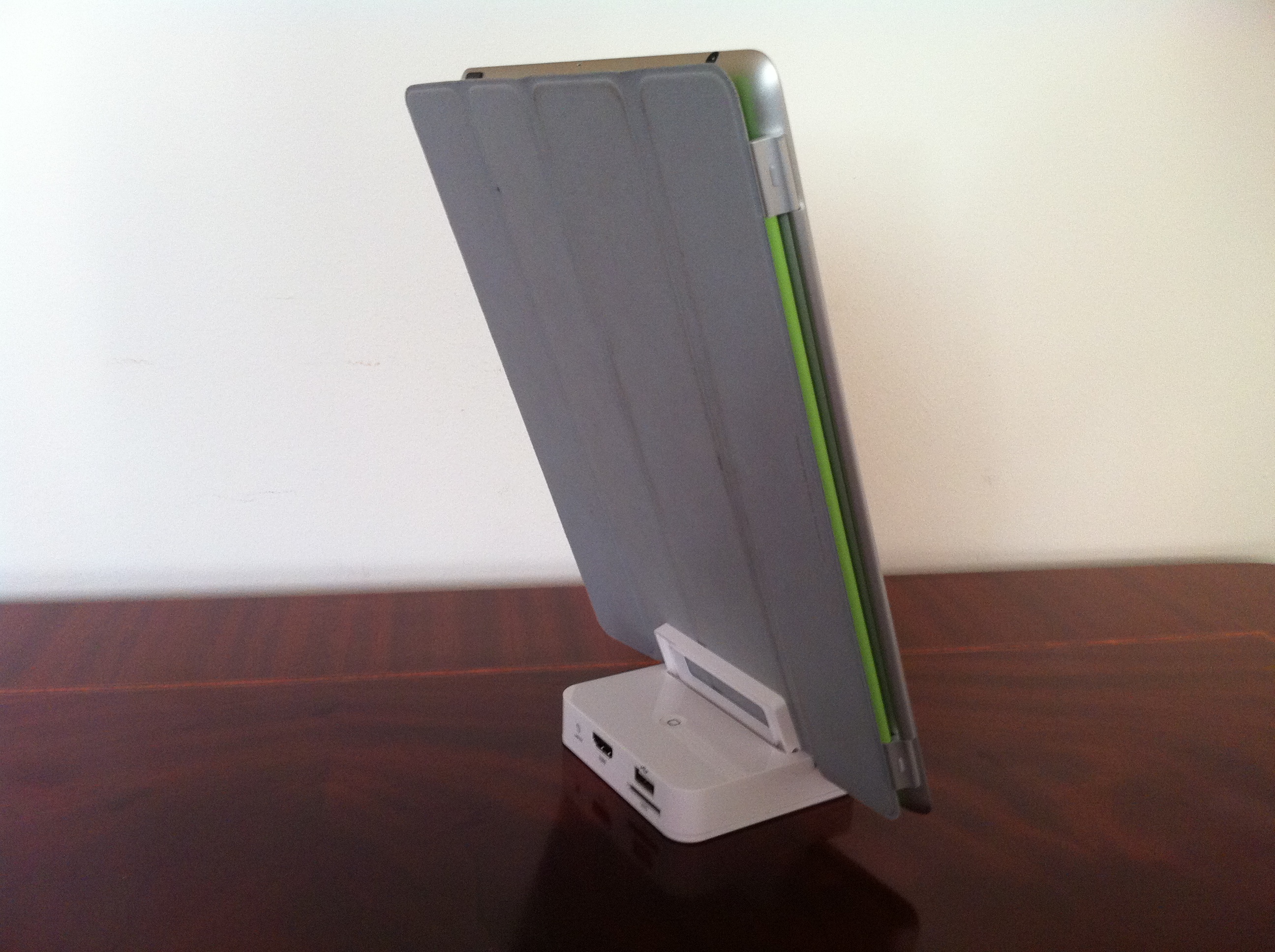 Per quanto riguarda l’iPad 2 sarà conveniente utilizzare la Smart Cover o un piccolo spessore che mantengano il dispositivo sollevato. Il peso del tablet lo fa inclinare troppo e non fa combaciare bene i connettori. Questo rischia di non far funzionare in maniera ottimale l’HDMI Dock.