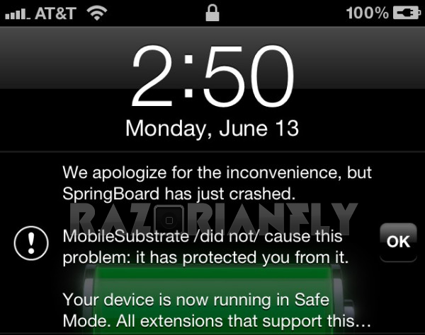 Un altra esempio potrebbe essere il crash della Springboard a seguito del quale il dispositivo potrebbe entrare in “Safe Mode”. Anche in questo caso, come mostrato dall’immagine in basso, vi sarà un apposito messaggio (ben distinguibile dagli altri presenti nella lockscreen) ad informarci.