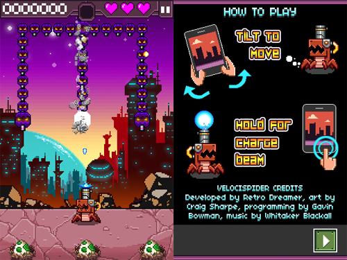 La meccanica di gioco si basa sull’utilizzo dell’accelerometro del nostro dispositivo, per cui per spostare il vostro veloci-ragno sarà necessario far oscillare l’iDevice in base alla direzione che vorremo far prendere all’animaletto. I comandi sono molto basilari e alla portata di tutti, in quanto oltre allo spostamento, l’unico altro comando è quello dello sparo potenziato, ovvero la possibilità, tenendo premuto lo schermo per un breve lasso di tempo, di far accumulare energia al cannone posto sulla nostra testa, per poi rilasciare e sparare un proiettile energetico molto forte in grado di penetrare diverse file di nemici. Degno di nota è anche il comparto audio con musiche che si adattano perfettamente allo stile del gioco.