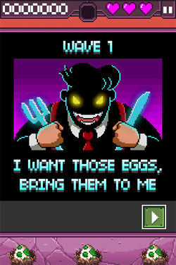 Il gioco si svolgerà su una serie progressiva di 20 livelli in cui dovremo impegnarci sempre di più per difendere le nostre uova dai nemici. In ogni livello avremo 3 uova da difendere e 3 vite a disposizione: una volta che le uova saranno state tutte catturate o le nostre 3 vite terminate, avremo perso la partita e dovremo ricominciare il livello da capo.