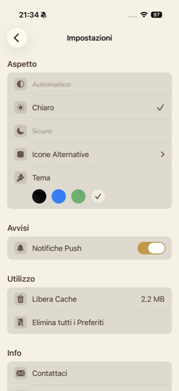- Possibilità di monitorare la dimensione della cache e di liberarla con un tap, dalle Impostazioni