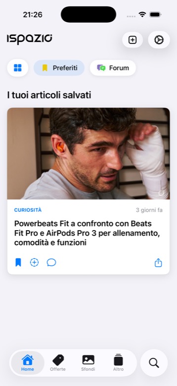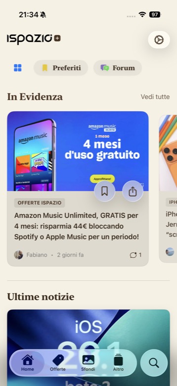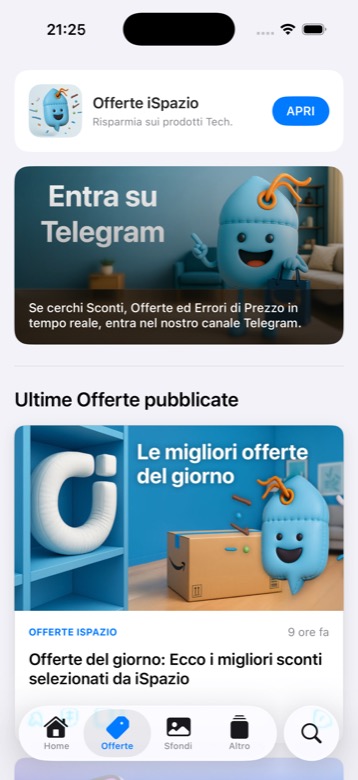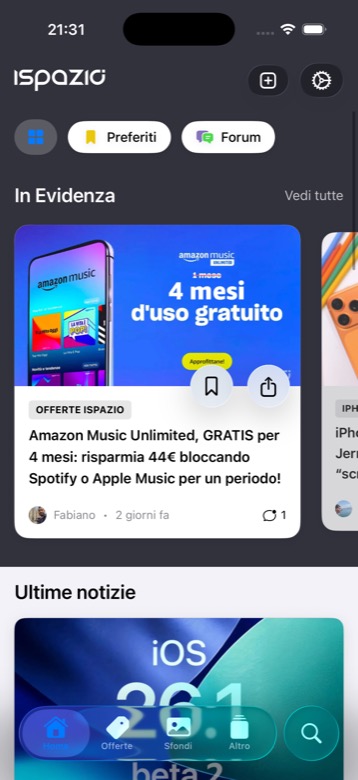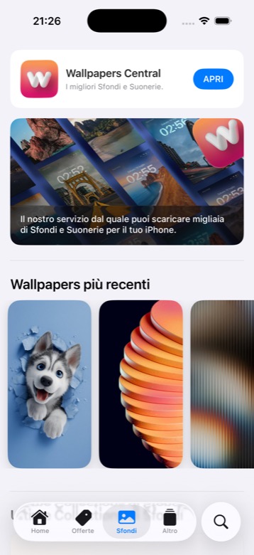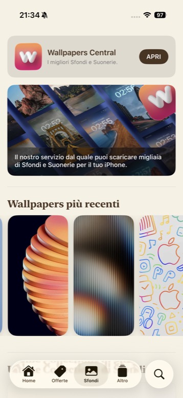 L’app integra bene anche i nostri servizi. Ad esempio, il tab “Offerte” offre un accesso rapido ai prodotti in sconto ed al canale Telegram di “Offerte iSpazio“, particolarmente utile a partire da questa mezzanotte per la Festa delle Offerte Prime e poi anche quotidianamente per acquistare prodotti ad un prezzo ridotto. Il tab “Sfondi” invece, è ben integrato con il nostro servizio Wallpapers Central, e vi mostrerà gli ultimi sfondi caricati sull’altra app. Con un tocco sull’anteprima aprirete direttamente Wallpapers Central, già nella schermata di download: tutto integrato perfettamente!