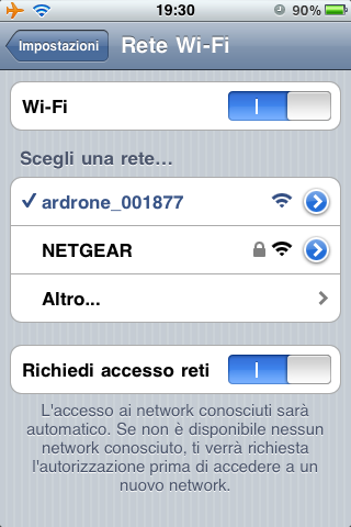 Prima di tutto andiamo nelle Impostazioni del nostro dispositivo Apple, abilitiamo l’Uso in aereo per massimizzare il wireless e poi colleghiamoci all’access point Wireless dell’AR.Drone.
