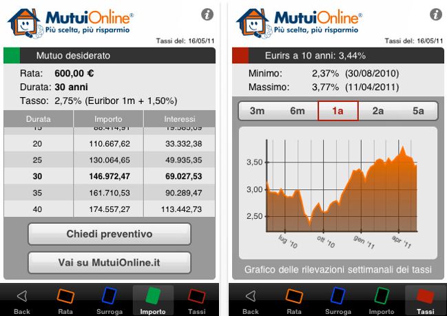 L’applicazione gratuita offerta da MutuiOnline, il leader in Italia nella distribuzione indipendente di mutui e prestiti, operante tramite il sito www.mutuionline.it, consente di effettuare le simulazioni finanziarie necessarie per calcolare la rata o l’importo del mutuo, oltre ad offrire informazioni sui valori e gli andamenti nel tempo dei tassi di interesse. [appscreens 435095989]