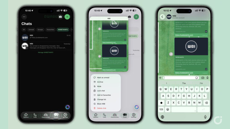 Il cambiamento più evidente riguarda la barra delle schede nella parte inferiore dello schermo, ora caratterizzata da superfici morbide e trasparenti che ricordano il vetro lucidato tipico dell’estetica di iOS 26. Il risultato è un look più coerente con l’ambiente grafico di Apple, capace di fondere WhatsApp in modo più armonioso con il resto del sistema.