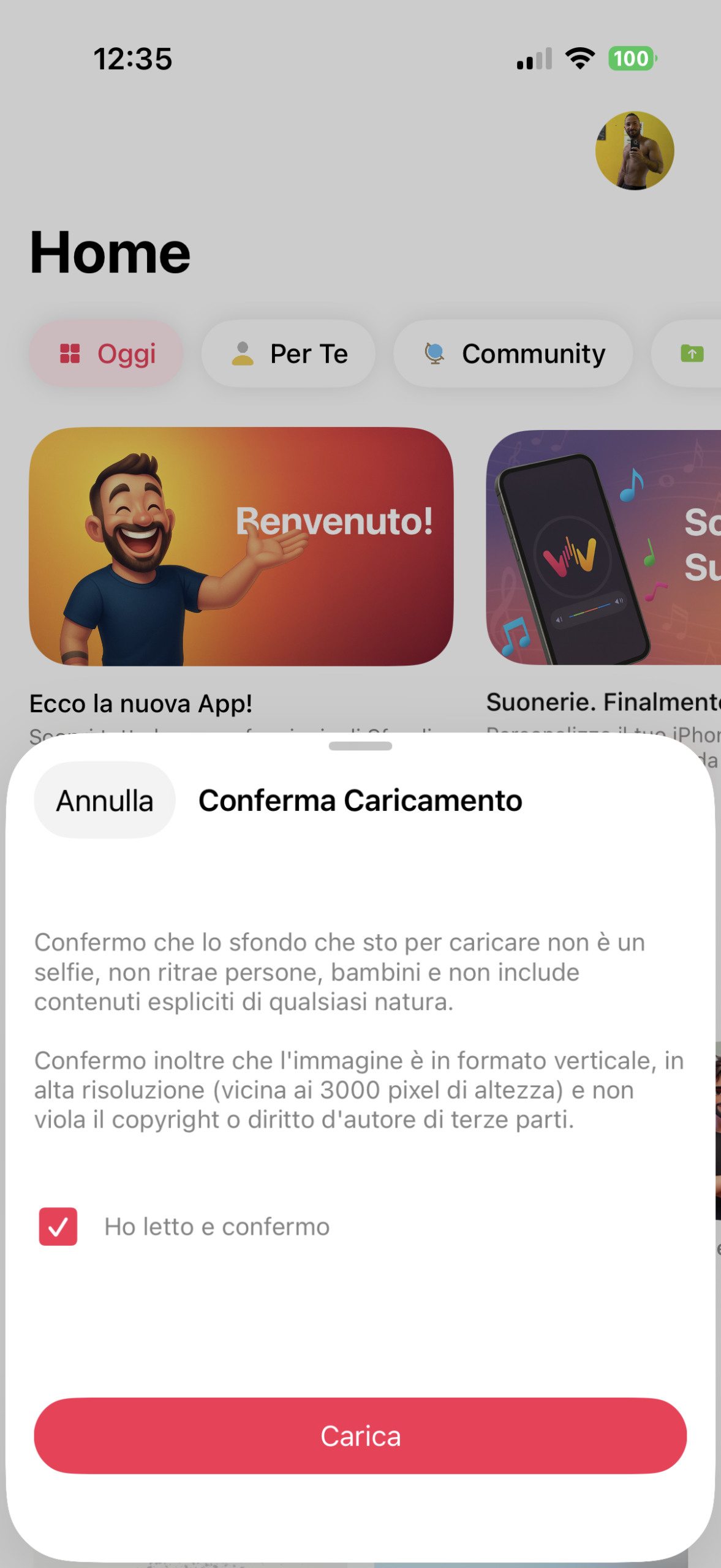 - Dopo aver compilato i campi obbligatori della prima schermata, il tasto Avanti diventerà lilla e potrà essere cliccato facendo apparire una pagina completamente nuova che prima non esisteva. Si tratta di una pagina di conferma con delle regole. L’app offre a qualsiasi utente la possibilità di caricare degli sfondi da far apparire sul sito e nell’app ma tutti gli sfondi sono soggetti ad approvazione manuale ed in questi giorni sono arrivati un numero incredibile di sfondi di bassa qualità, selfie, foto di bambini, animali domestici, risoluzioni bassissime o semplicemente non conformi alle nostre regole, pertanto ho deciso di creare questa pagina informativa nella quale va inserita una spunta manuale prima di continuare con l’upload vero e proprio. Se gli upload saranno più accurati, sarà più veloce anche la moderazione / approvazione.