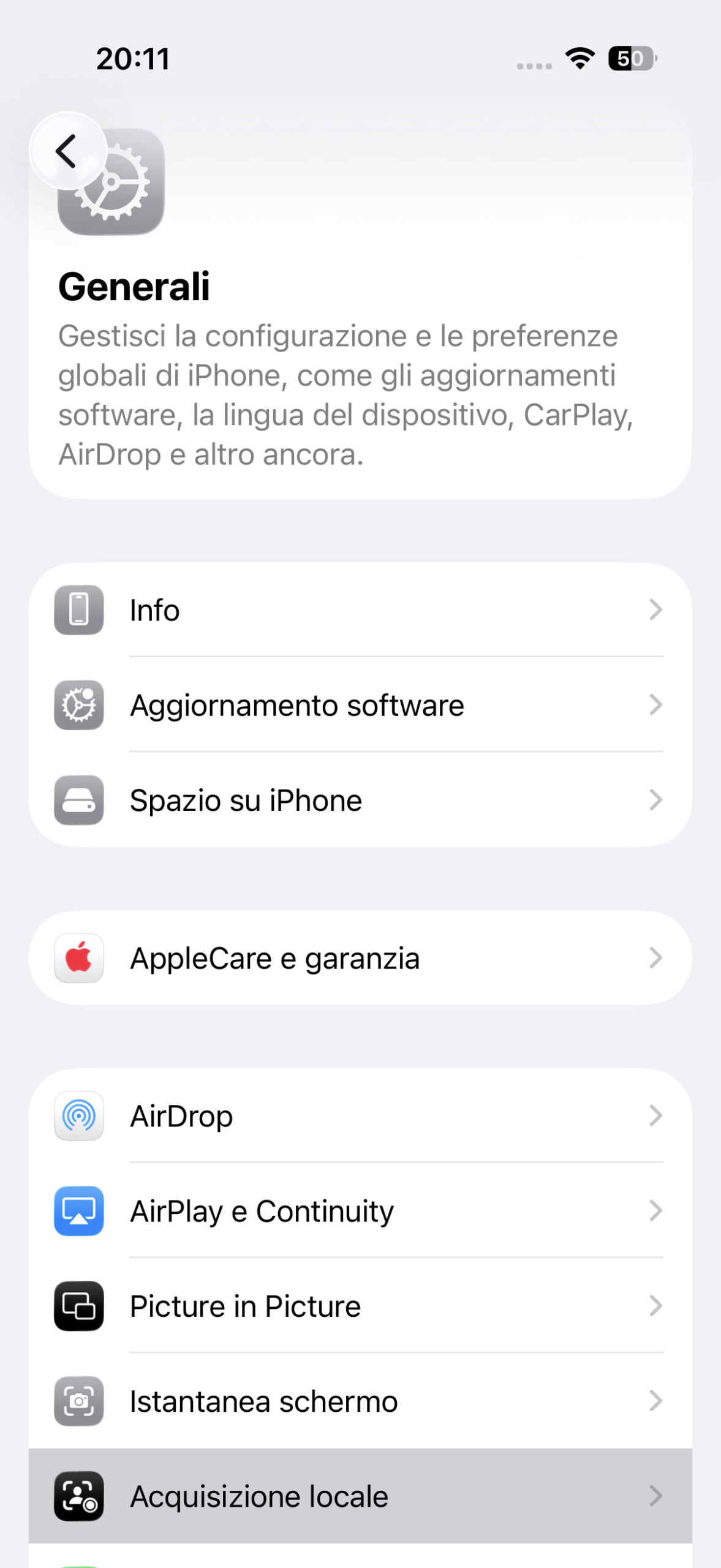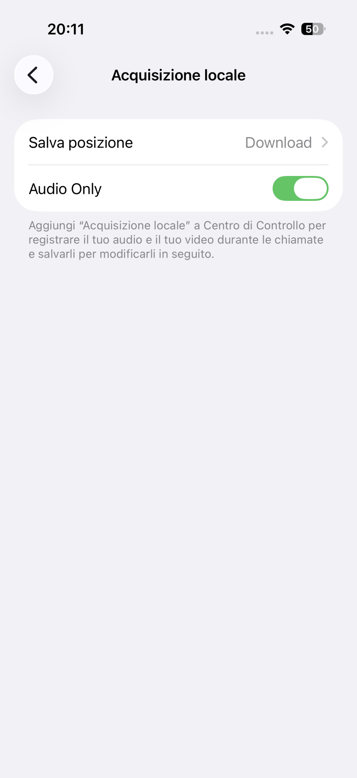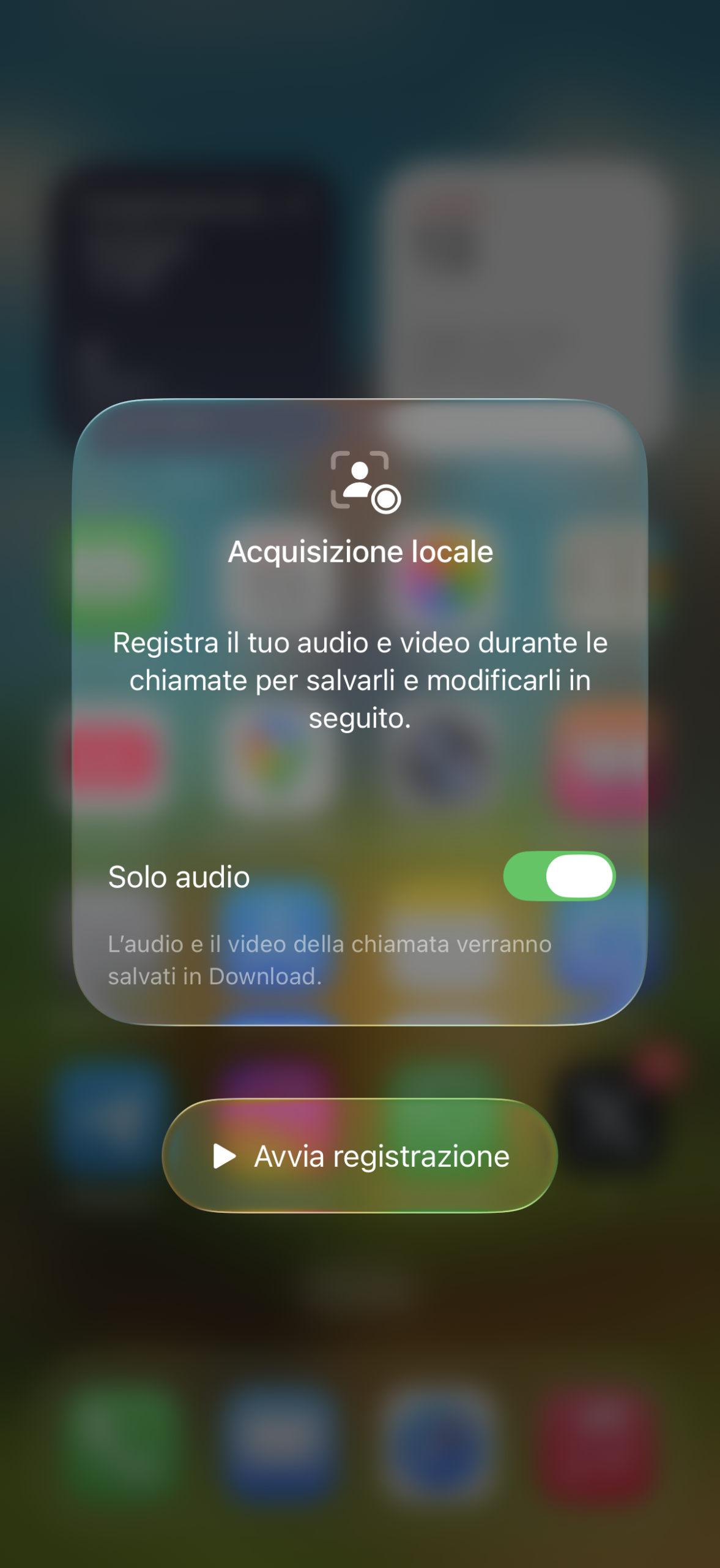In Impostazioni > Generali troviamo “Acquisizione locale” che permette di aggiungere un tasto al Centro di Controllo attraverso il quale potremo registrare audio e video durante le chiamate e salvare i file per modificarli in un momento successivo.