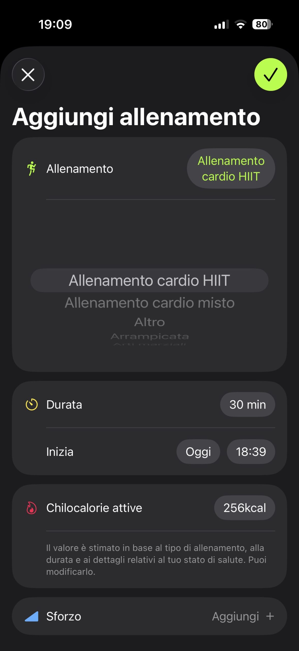 Dopo aver selezionato la tipologia e la durata, iOS calcolerà automaticamente una stima delle calorie attive in base ai dati personali registrati in Salute, ma l’utente potrà comunque modificare il valore per inserire un numero più preciso.