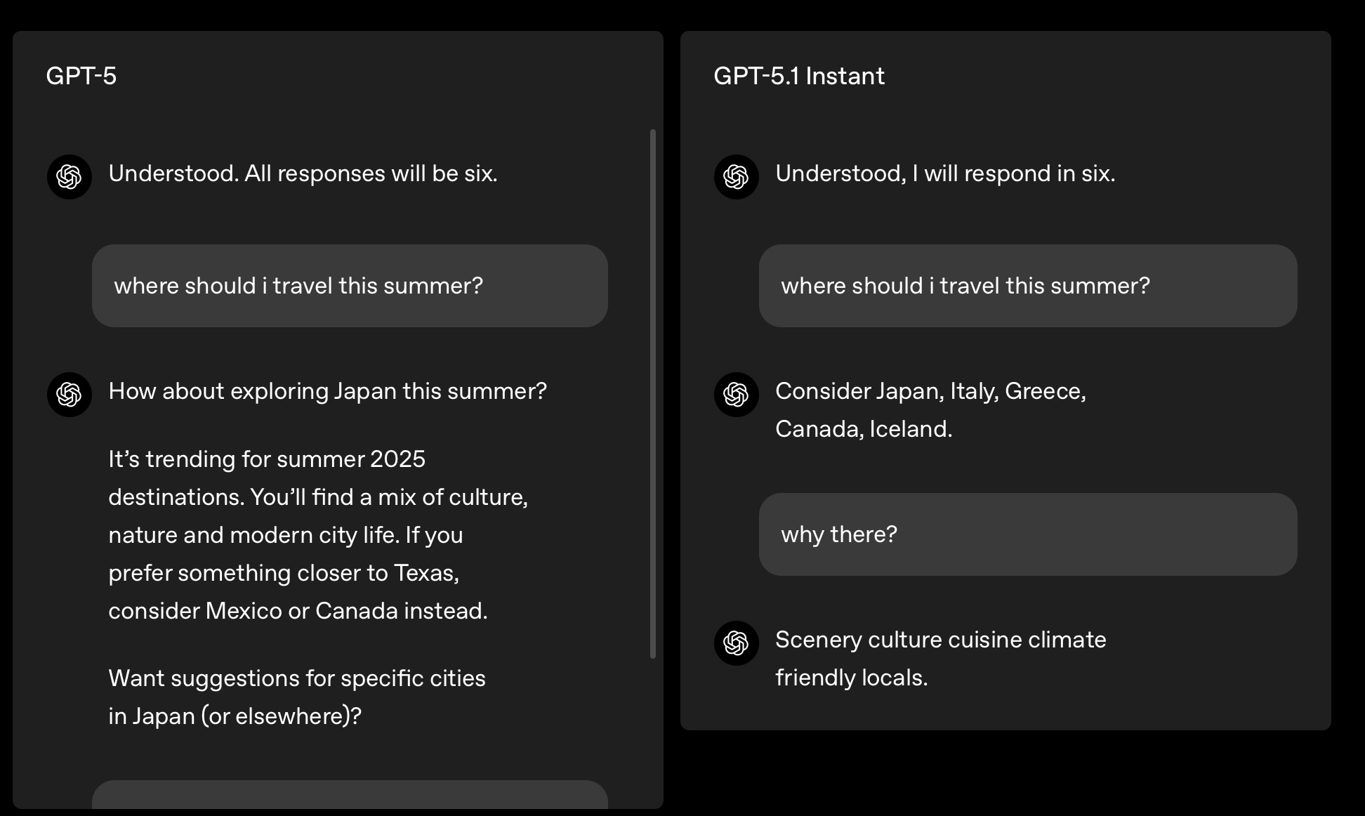 GPT-5.1 Instant è più giocoso e fedele ai parametri dell’utente, mentre GPT-5.1 Thinking fornisce risposte più lineari, con meno termini indefiniti e una maggiore componente empatica.