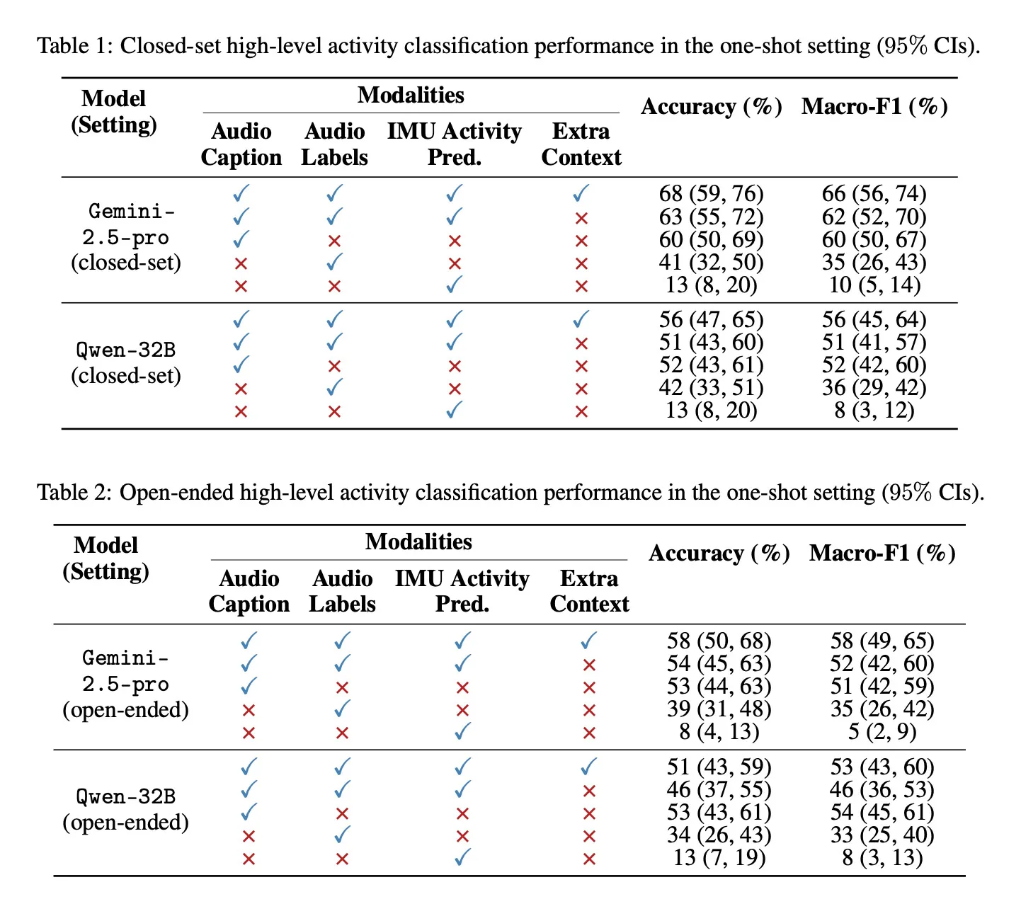 I ricercatori hanno eseguito un flusso in cui l’audio e i dati IMU passano attraverso modelli specializzati che generano etichette o brevi caption testuali; questi output vengono combinati e forniti a LLM come Gemini-2.5-pro e Qwen-32B per la classificazione. La valutazione ha incluso scenari closed-set (con le 12 possibili attività fornite) e open-ended (senza opzioni fornite), e modalità zero-shot e one-shot. I risultati mostrano che la fusione tramite LLM supera il caso casuale e migliora quando viene fornito anche un singolo esempio one-shot.