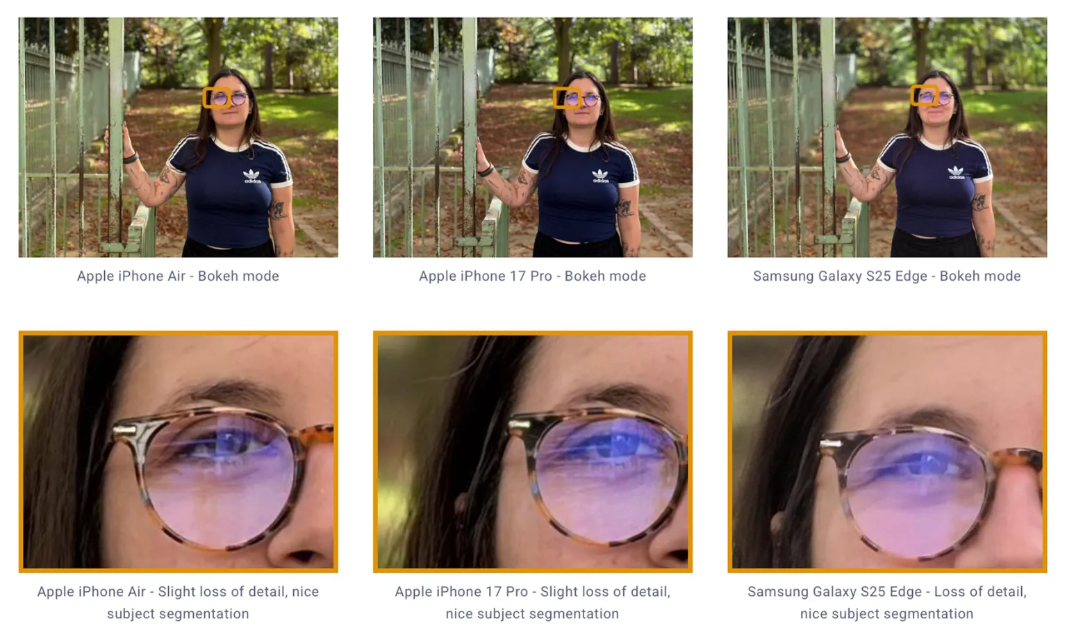 Sempre dal test leggiamo che bokeh e segmentazione dei soggetti funzionano sorprendentemente bene. È un aspetto su cui l’iPhone Air riesce a superare il Galaxy S25 Edge, e in alcune comparazioni i contorni sono addirittura più puliti rispetto a quelli del 17 Pro.