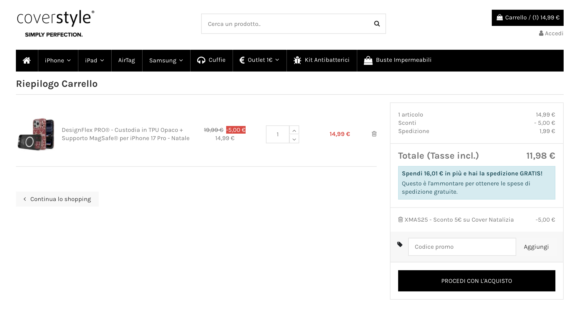 La promozione per ricevere anche la pellicola in vetro temperato è valida solamente sul sito ufficiale www.coverstyle.it – Inserendo il coupon XMAS25 verrà applicato lo sconto di €5 e la pellicola in vetro temperato in omaggio sarà inclusa nella confezione (non visibile nel carrello)!