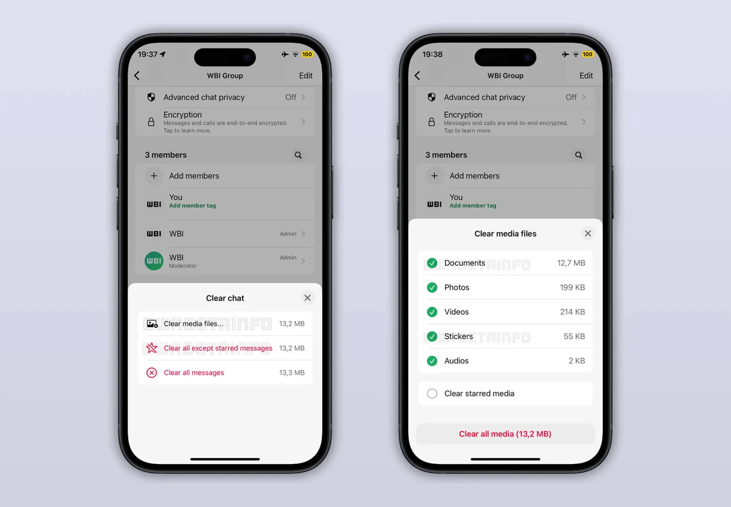 A pochi giorni di distanza, Meta ha rilasciato un’altra beta, la 25.37.10.72, focalizzata questa volta sulla gestione delle chat e dello spazio occupato. Qui l’obiettivo sembra essere la semplificazione. La nuova interfaccia permette di cancellare i messaggi di una conversazione in modo più chiaro, distinguendo tra contenuti testuali e file multimediali e mostrando in modo immediato quanto spazio occupano le diverse tipologie di contenuti.