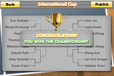 Al primo avvio, ci troviamo di fronte alla schermata di benvenuto che riassume le modalità di gioco: tutorial e arcade. La prima ovviamente fa partire una breve fase di apprendimento in cui il vostro coach vi spiegherà le principali regole del ping pong e come sono disposti i comandi di gioco sul dispositivo iOS. La modalità arcade, invece, consiste in una competizione contro il computer in cui sono presenti personaggi provenienti da tutto il mondo. Man mano che scaleremo la vetta della classifica, e quindi procederemo attraverso ottavi, quarti, semifinale e finale, saremo chiamati a gareggiare contro avversari sempre più competitivi.