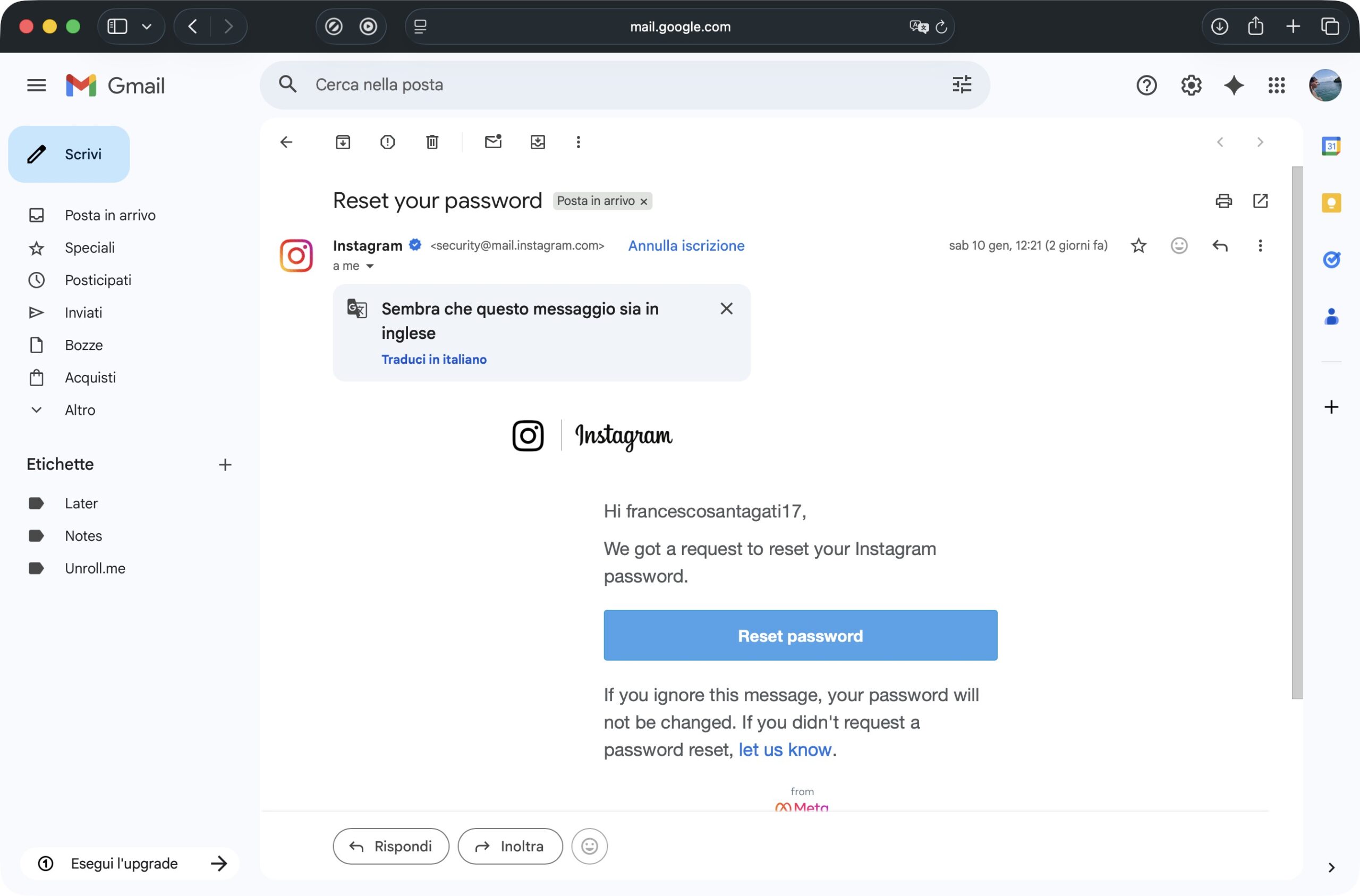 La smentita ufficiale è arrivata dopo la diffusione di uno screenshot (uguale all’immagine sopra), condiviso su Bluesky e ripreso da Malwarebytes, che mostrava un’email autentica di Instagram relativa a una richiesta di reset della password. Un elemento che, pur non dimostrando una violazione diretta dei sistemi, ha contribuito ad alimentare l’incertezza.