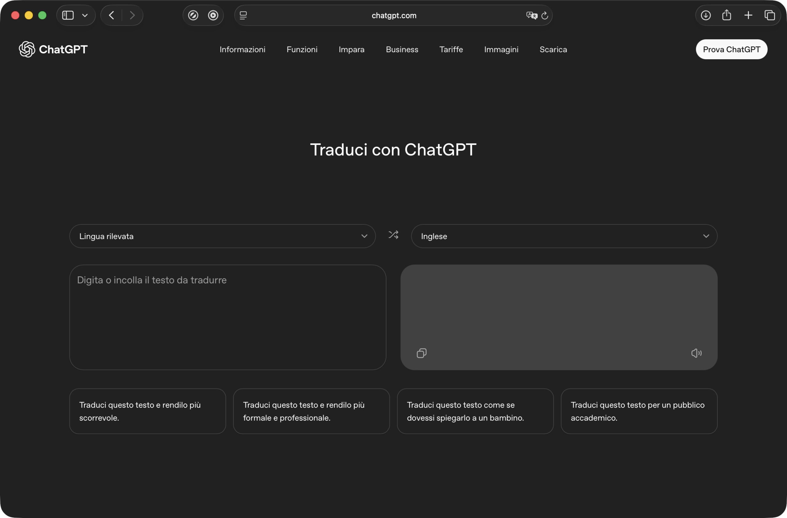 Selezionare una di queste opzioni non modifica semplicemente il testo: apre l’interfaccia principale di ChatGPT con un prompt già pronto. È qui che emerge la logica del prodotto. La traduzione non viene trattata come un output definitivo, ma come materiale grezzo, da modellare attraverso istruzioni successive.